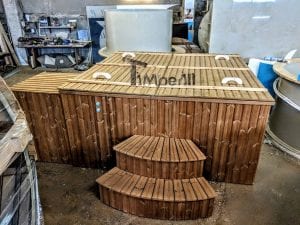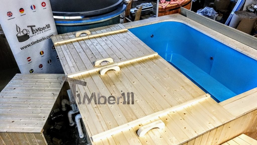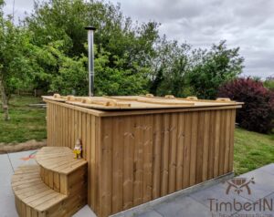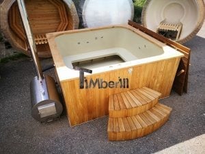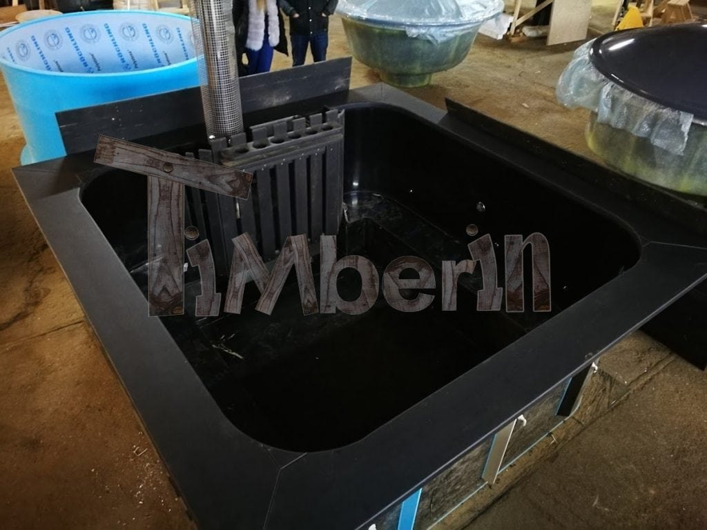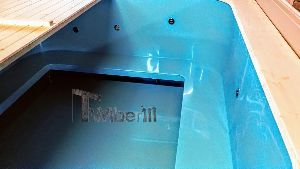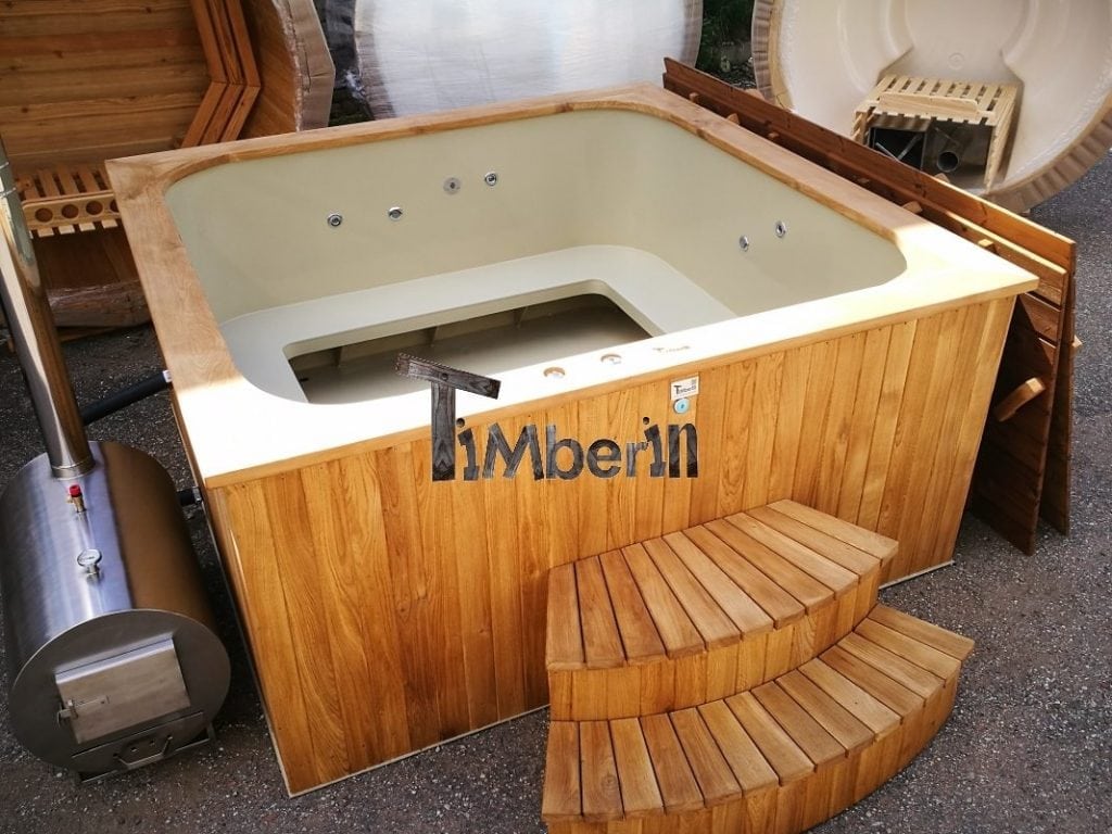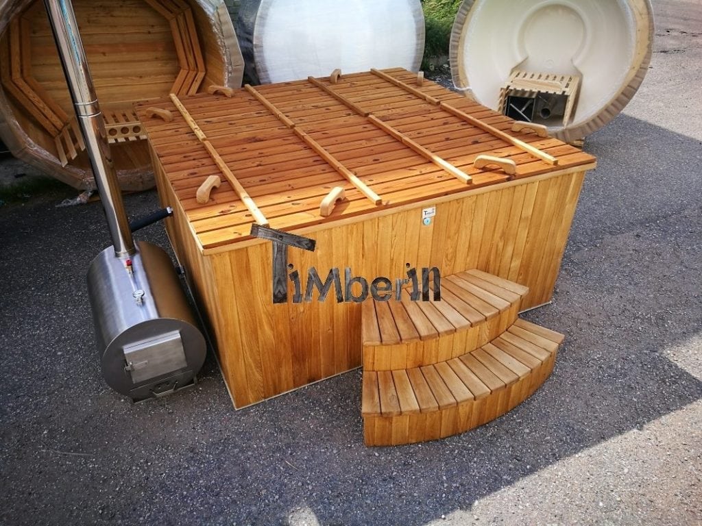 A szögletes fából készült pezsgőfürdőnek saját külső fűtőberendezése lehet, legyen az fatüzelésű vagy elektromos fűtőberendezés. Ráadásul sznorkel is lehet hozzá. Még intelligens SPA-berendezéseket is integrálhat, testre szabhatja a padokat stb.